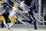 Cascade Christian running back Bryson Walker (2) breaks loose for a 44-yard touchdown on the first drive of the game against Gervais in their Class 3A state semifinal playoff game Saturday at Cottage Grove High School. The Challengers won 36-0.