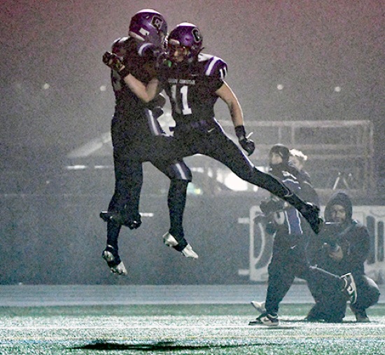 Cascade Christian's Alex Fiannaca (left) and Seth Scaglione (11) celebrate after Fiannaca scored a touchdown on a 20-yard pass from Deryk Farmer with 4:38 left in the third quarter during the Class 3A football state championship game on Saturday night at Summit High School in Bend. The Challengers defeated Burns 35-28 to win the state title and Fiannaca was named the Challengers' player of the game.