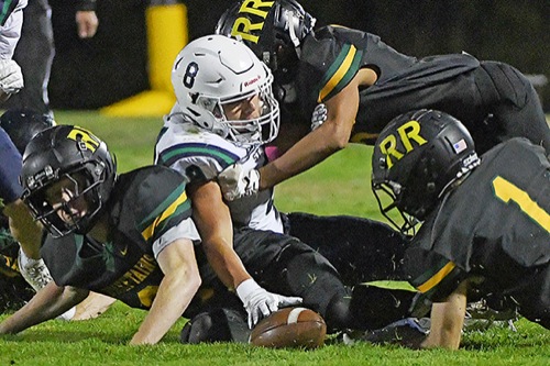 Dom Hiratzka (8) of St. Mary's reaches for a squibbed Crusader kickoff during the first quarter on Friday night at Chieftain Stadium as Rogue River's Sean Murray (left) and Mathew Smith (1) also try to recover the ball. Smith was the player who came up with the football for Rogue River. The Chieftains defeated the Crusaders 65-42.