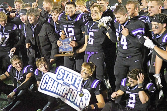 Cascade Christian quarterback Deryk Farmer (12) holds the Class 3A state championship trophy as he poses with teammates for photos following the Challengers' 35-28 victory over Burns in the state title game at Summit High School in Bend on Saturday night.