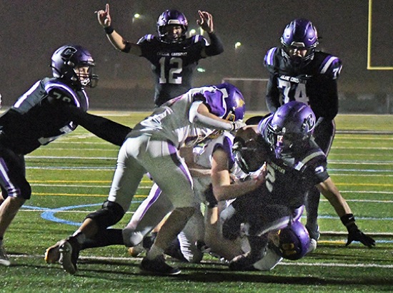 Cascade Christian running back Bryson Walker (2) plows his way into the end zone to score a 3-yard touchdown against Burns with 1:25 remaining in the Class 3A football state championship game Saturday night at Summit High School in Bend. Walker's touchdown provided the margin of victory as the Challengers defeated the Hilanders 35-28 to win the state title.