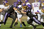 Cascade Christian's defense swarms Burns quarterback Jack Wright during the Class 3A football state championship game Saturday night at Summit High School in Bend.